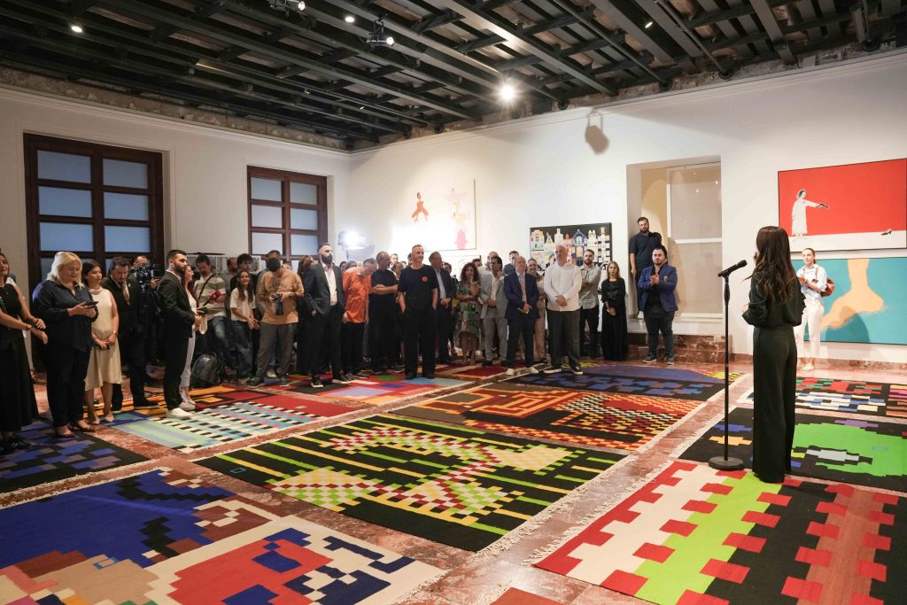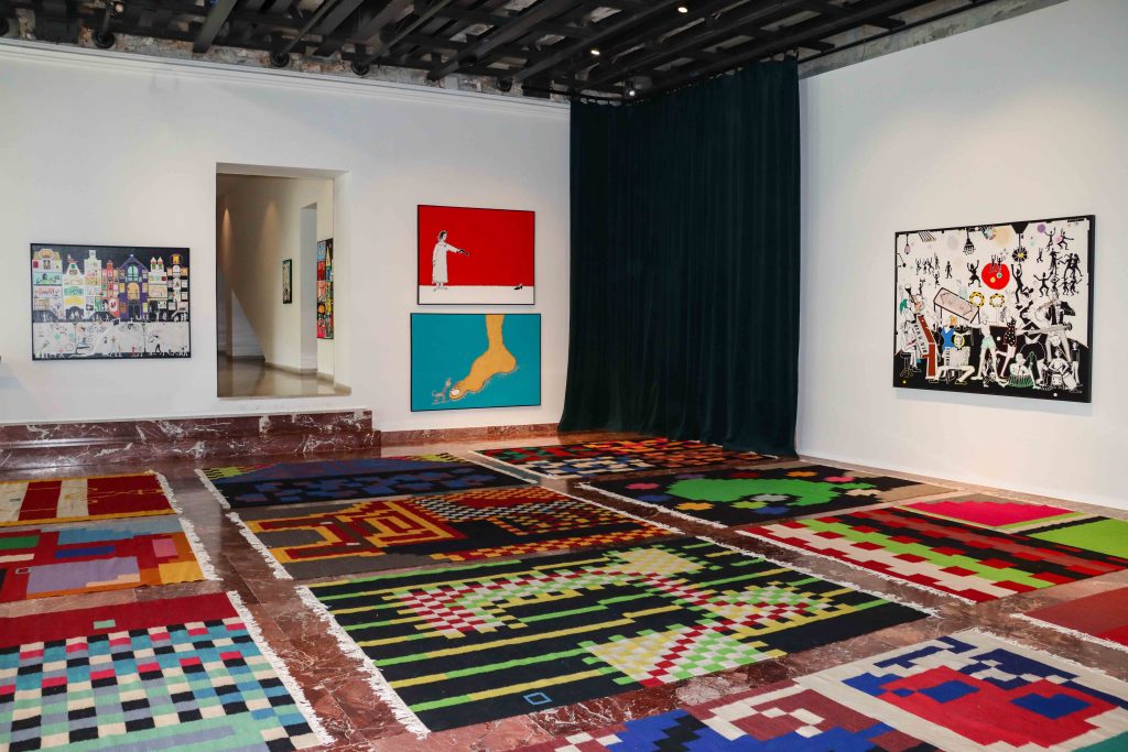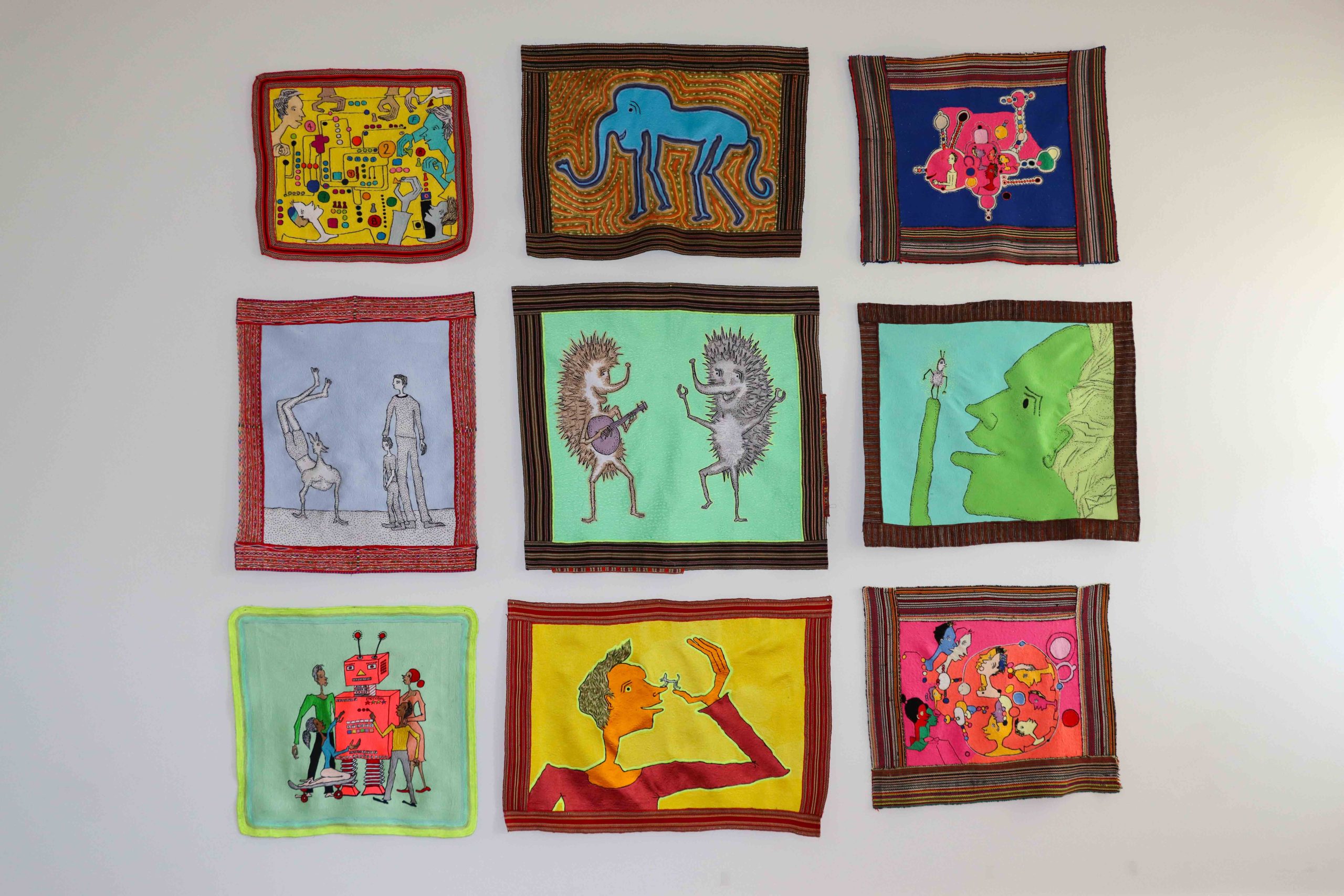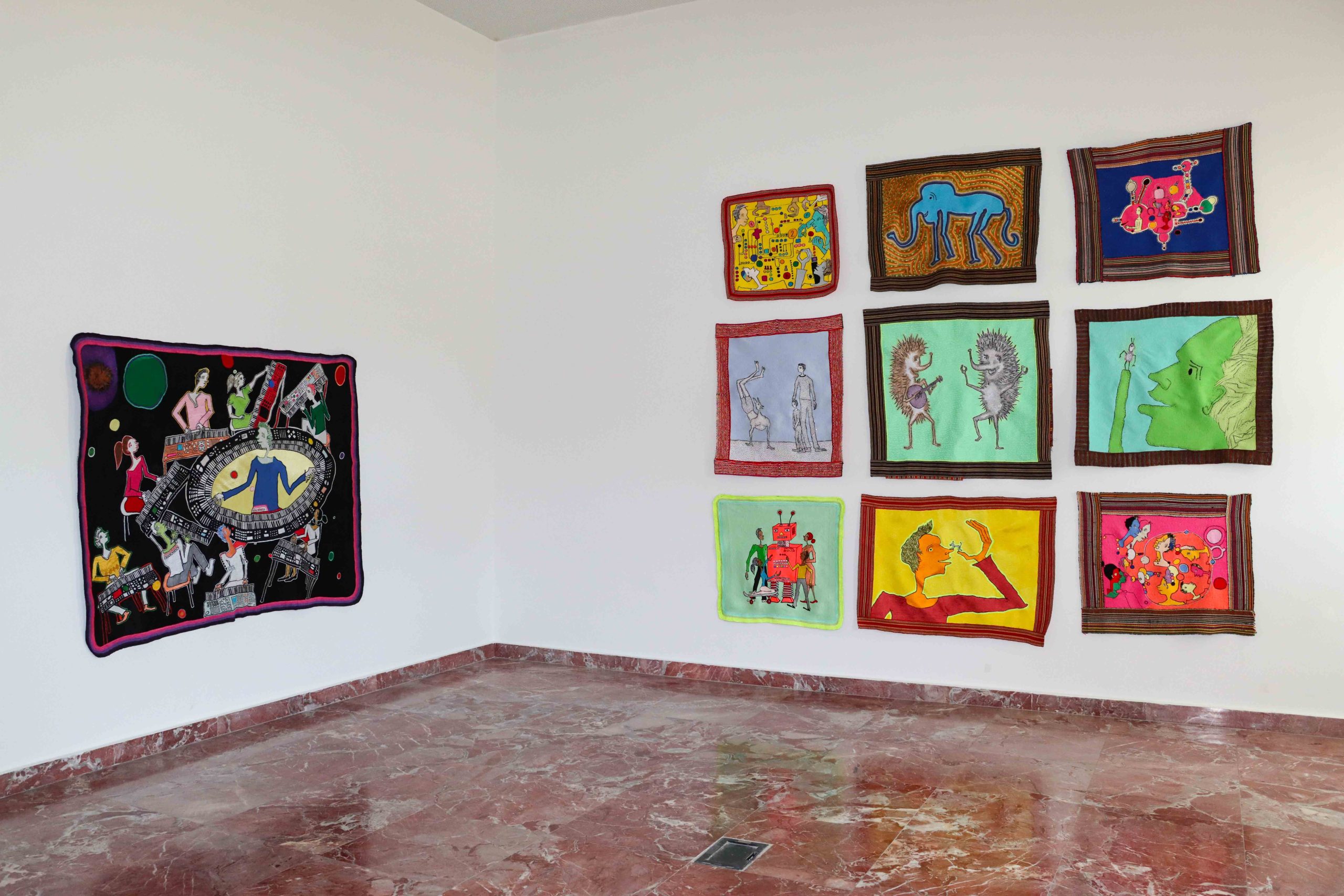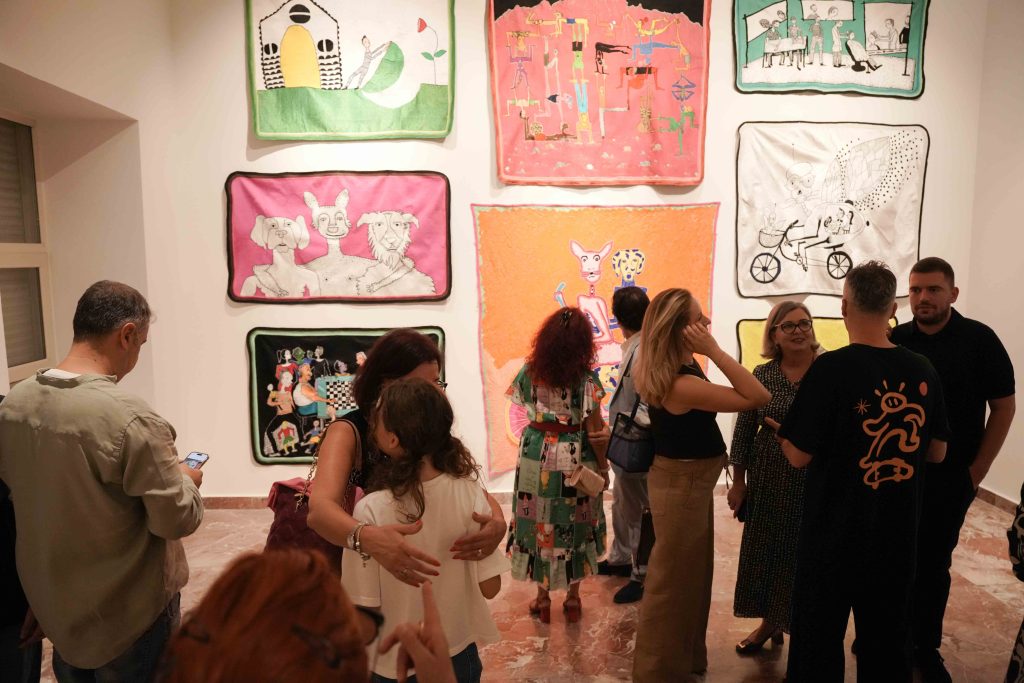The human figure, often placed in whimsical or dreamlike situations, is accompanied by animal shapes, domestic objects, or architectural forms that resemble unfinished dreams. Beneath this naive and poetic visual language lies a logic of collaboration and resilience: many of the textile works have been produced in cooperation with women artisans from Kosovo and the region, integrating into the artistic act communities that are rarely represented in institutional art spaces.