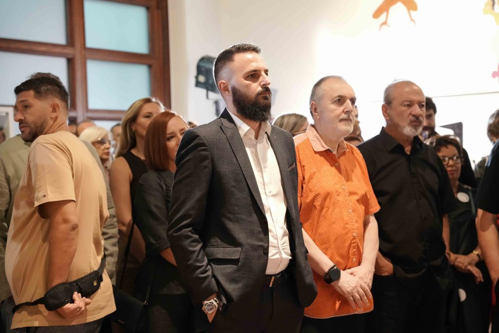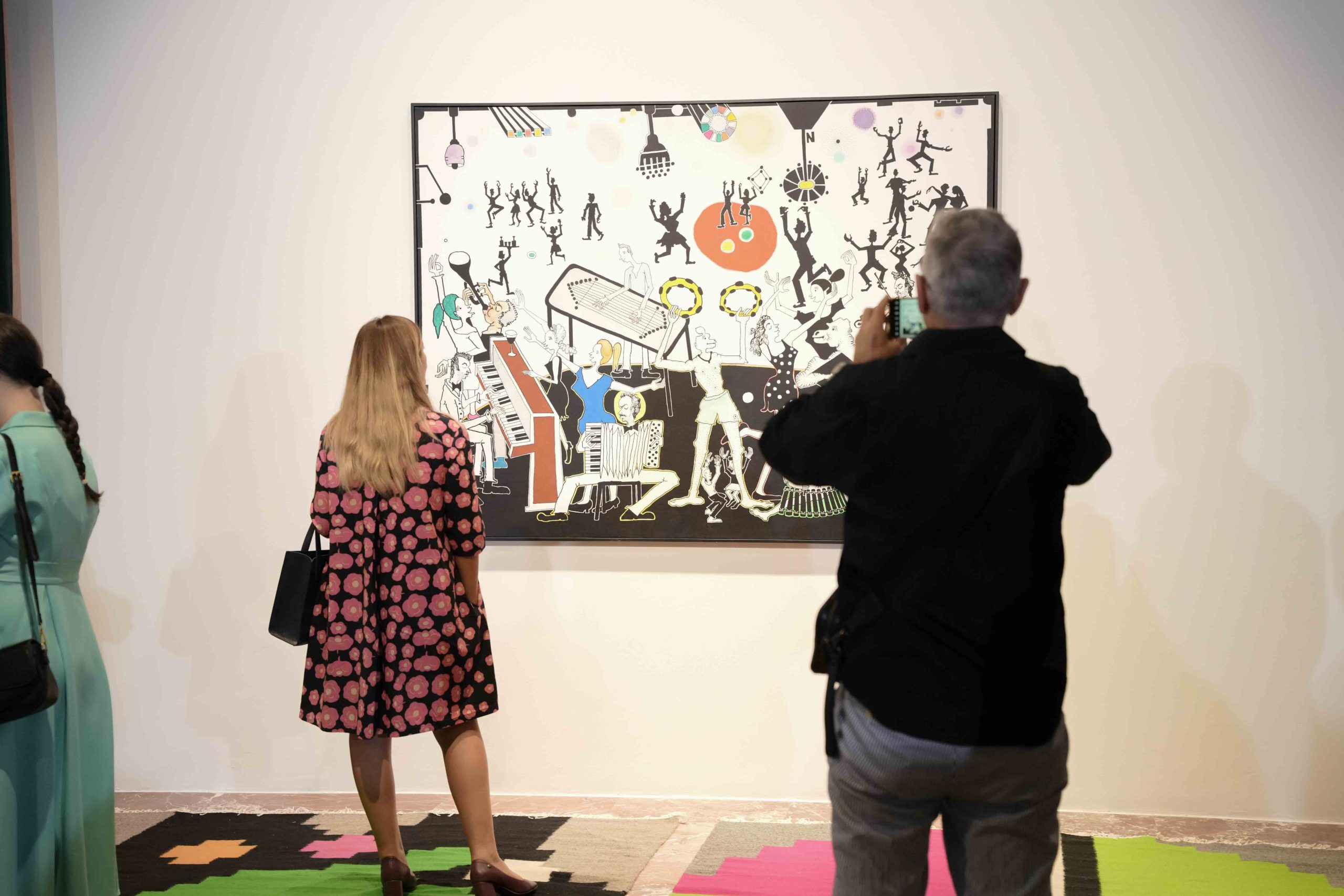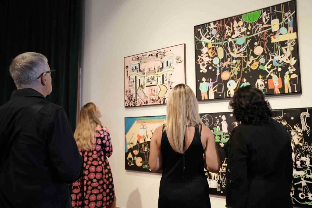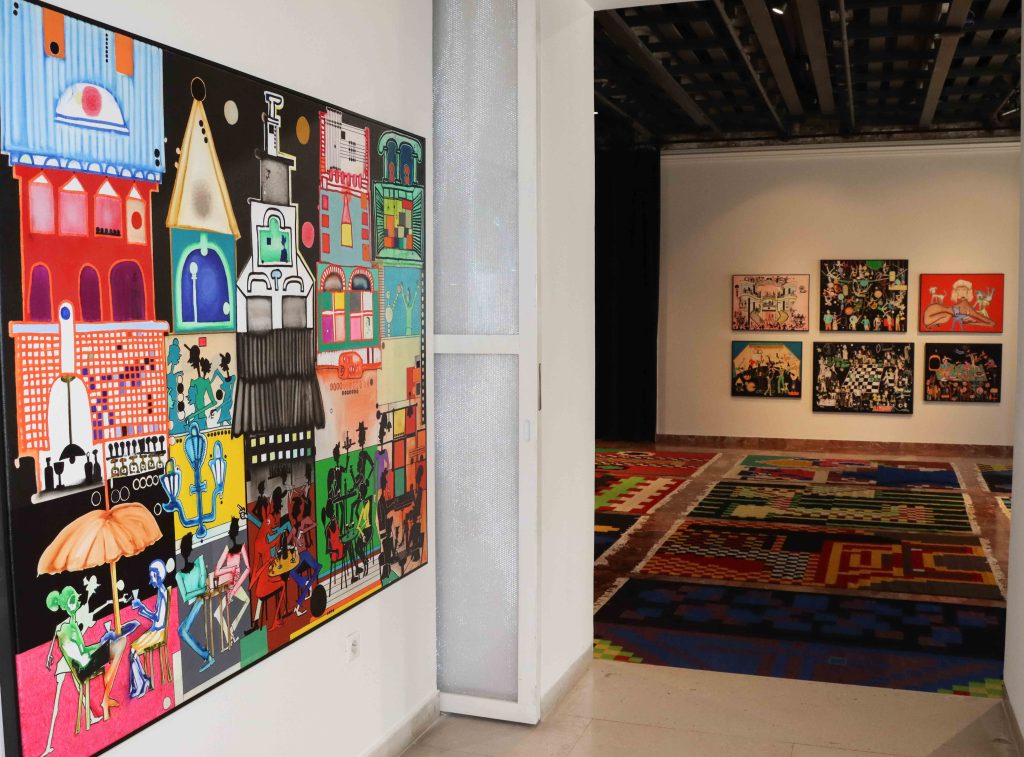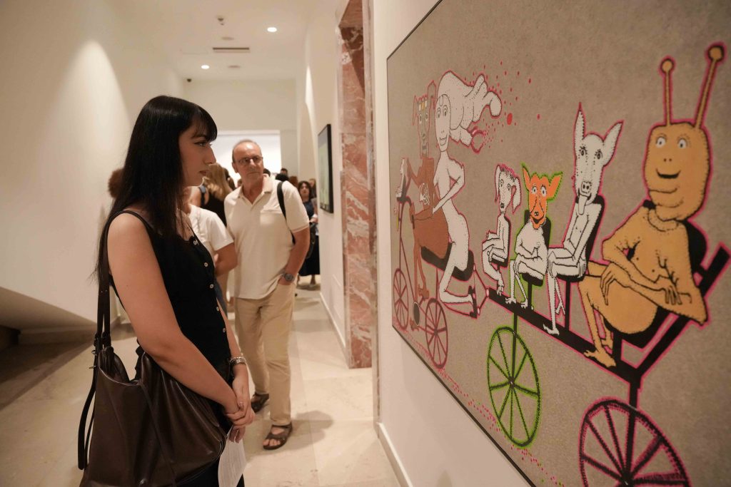 The human figure, often placed in whimsical or dreamlike situations, is accompanied by animal shapes, domestic objects, or architectural forms that resemble unfinished dreams. Beneath this naive and poetic visual language lies a logic of collaboration and resilience: many of the textile works have been produced in cooperation with women artisans from Kosovo and the region, integrating into the artistic act communities that are rarely represented in institutional art spaces.